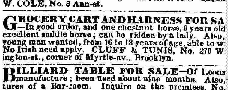 Authentic 1854 newspaper ad from The New York Times explicitly stating "No Irish Need Apply," exemplifying job discrimination against Irish Catholics in Protestant America.